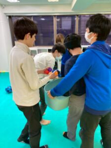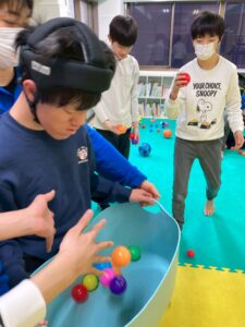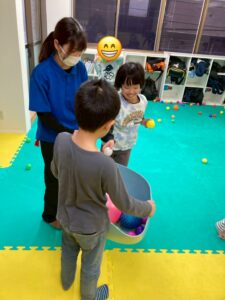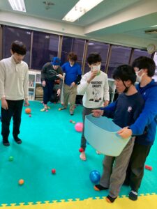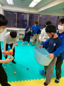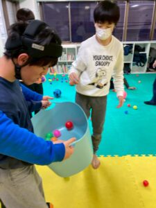 大小様々なボールをチームのみんなで協力してお片付けします!