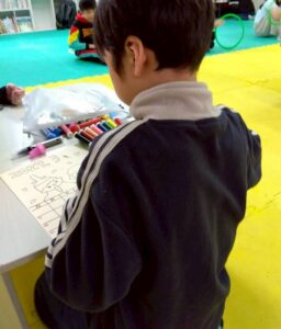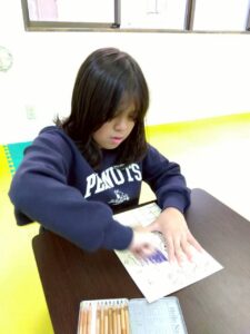スタッフにプリントを渡して課題に取り組む活動では、指示を聞きながら落ち着いて取り組む姿が見られました。