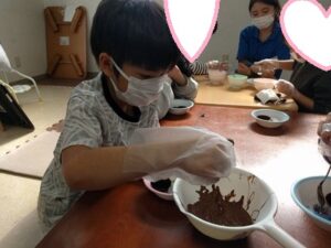 板チョコを割ったり、大きなボウルをしっかり押さえながら、スプーンでゆっくりとかき混ぜる姿が見られました☺