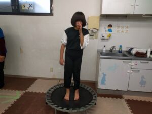 運動では、最初の子がトランポリンを5回跳んだあと平均台を渡ります。