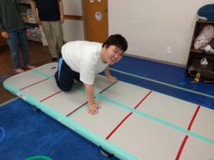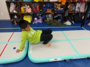 マット運動では、両手をしっかり床につき、体を支えながら前に進む動きに挑戦しました。