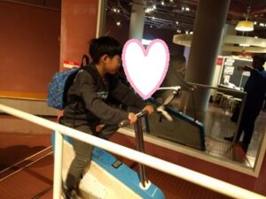 自転車コーナーでは、漕ぐと、横のミラーから、自分の体が骨になって見え体の動きをしっかりと観察していました(*^▽^*)