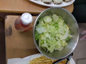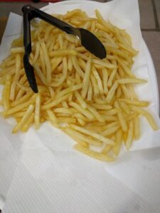 パンとハンバーグを焼き、ポテトを揚げて、レタスを入れて、