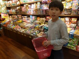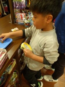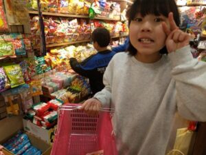 買い物かごにお菓子をのせてレジまで運び、お金を一枚ずつ置いて支払う様子もありました(*^▽^*)