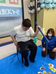 スタッフは近くで竿の動かし方を伝えたり、タイミングを一緒に見ながら安心して取り組めるよう関わっています(*^_^*)