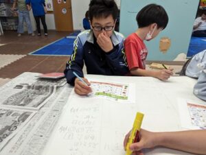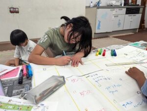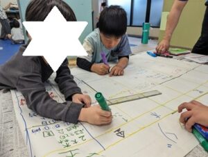 数字を書き込むお子さん、予定欄に「ダンス」などの活動名を書き入れるお子さんと、それぞれの役割で手を動かす姿が見られました。