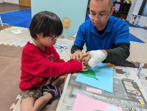 のり付けやシール貼りなど一つひとつの工程を一緒に行うので、無理なく楽しめます。