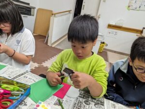 のりを指で伸ばして位置を確かめたり、はさみで形を整えたりと、それぞれのペースで集中して進めています。