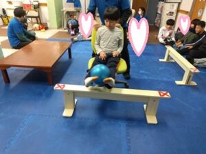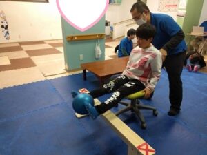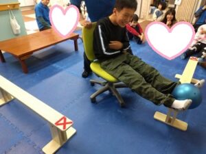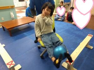 イスに座ってもらい、足でボールを持ちながら落とさずに進んでみようというゲームでしたが
