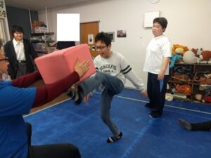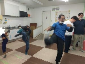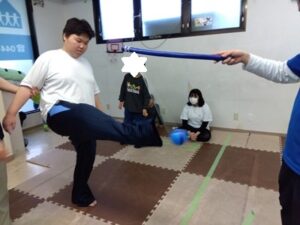 今日は体幹強化とバランス力向上に向けて、棒やボックスを目印に足を高く振り上げる運動に取り組みました。