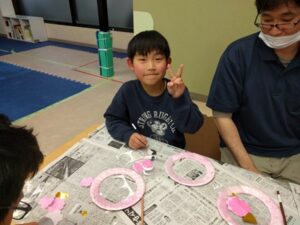 新聞紙を広げた机の上に、ピンク色の丸い台紙やお花のパーツを並べ、子どもたちは真剣な表情でのり付けをしていました。