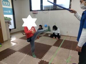 スタッフが持つ棒に吊るされたボールの高さを見ながら、足を大きく振り上げます。