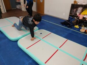 マット運動では、マットの上を進んだり姿勢を保つ運動に取り組みました(*^-^*)