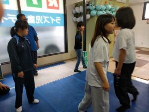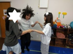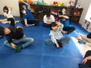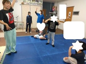 今日は体をしっかりほぐしながらリズムに親しむことに向けて、準備運動のあとダンス練習に取り組みました。