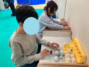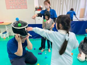 カラーボールを目標に向けて投げ入れるゲームを行いました。