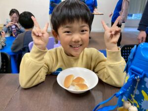 第二は『お豆腐でお餅を作ろう』です。お豆腐を砕いて片栗粉と一緒に混ぜ込みます。まあるい形や自分の好きな形にしてレンジでふやかせば、立派なお餅の出来上がり。好きなトッピングをしてふかふかをいただきま~す。