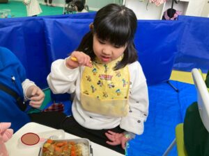 第一のお部屋でちぎちぎ、ペタペタ壁面工作をしていると、鬼が入ってきました。それ!豆をぶつけてやっつけろ。鬼は病気などの『悪いこと』の化身です。鬼に豆をぶつけて流行しているインフルエンザもやっつけろ!第二のお部屋でも鬼を追いかけて豆をぶつけて大盛り上がり。みんなの元気におされて鬼はすごすごと退散です。おやつには鬼まんじゅうも食べました。
