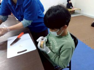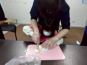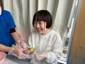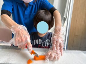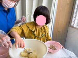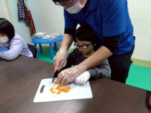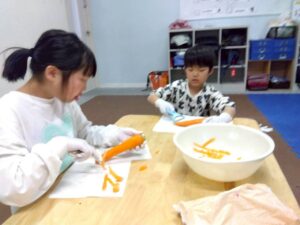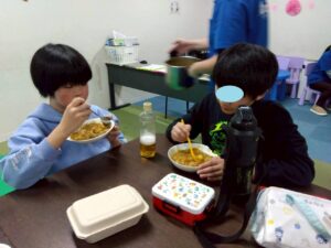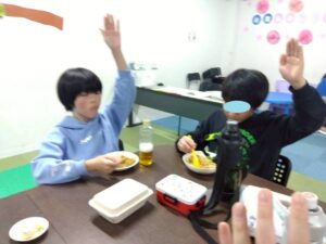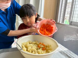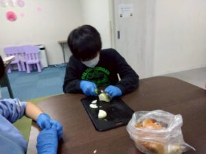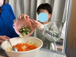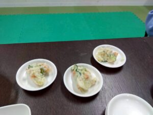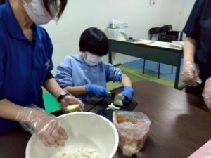 今日のレクは1と2合同です、カレーは第2教室で作り、ポテトサラダは第1教室が作りました。