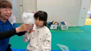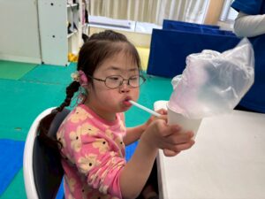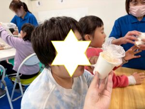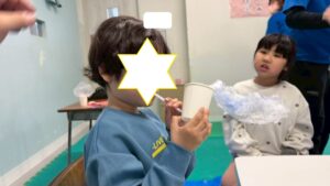 第一は『紙コップのもこもこオバケ』を作りましょう。紙コップとストロ-、そしてビニル袋。ビニル袋に思い思いに絵をかいて、ストロ-にセロテ-プでとめます。それを紙コップに通して息を吹きかけると紙コップからもこもこもこ…。面白かったね。