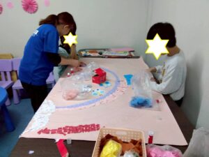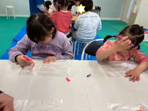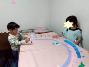 第二は『壁面工作』です。模造紙にちぎり絵で虹や桜を表現します。今日はあいにくの雨模様だけど、みんなの力で第二のお部屋は春らしい雰囲気になりました。
