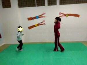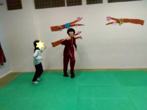 でも、第一のお部屋はそんなジメジメを吹き飛ばすような音楽とそれに合わせたみんなのダンスで元気いっぱいです。いつものようにウオーミングアップからダンス、ダンス、そして石飛びをはさんでまたダンス!お外は冬に戻ったように気温が低いけど、お部屋の中は熱気が充満しています。
