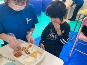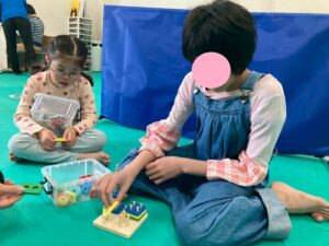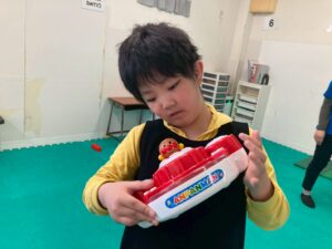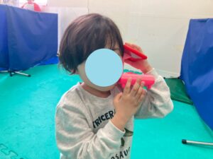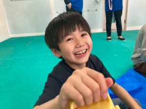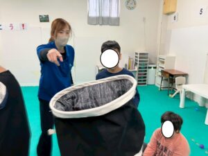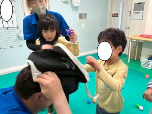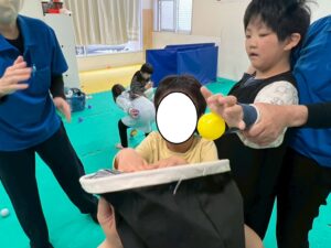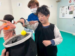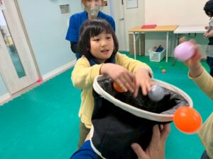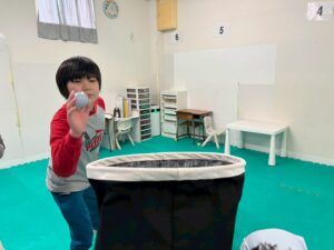 カラーボールを目標に向けて投げ入れるゲームを行いました。