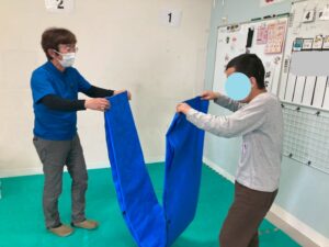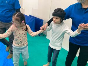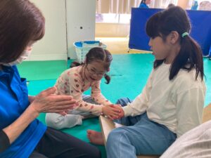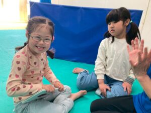 今日の第1教室のレクは「レッツリトミック」、音楽を聴きながら体を動かします!