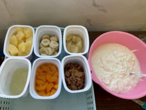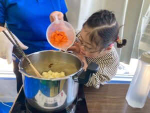 今日の第1教室はカレーライス作りです、デザートでフルーツヨーグルトも作りました。