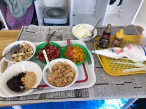 第1教室は「パフェ」作りです、トッピングはアイス・生クリーム・はちみつ・チョコシロップ・コーンフレーク・バナナ・あんこ・きなこ・いちご・マンゴーです。