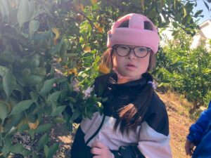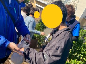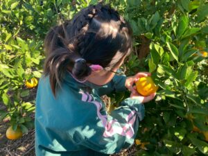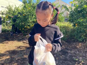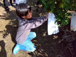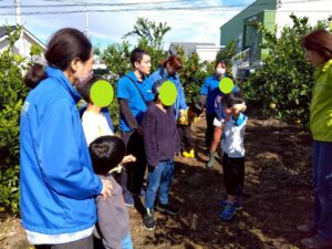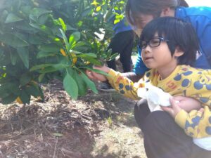 子ども達は「引っ張って採るのではなくて、クルクルと回しながら採ろうね」と言う説明を聞きながら