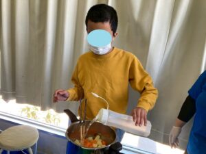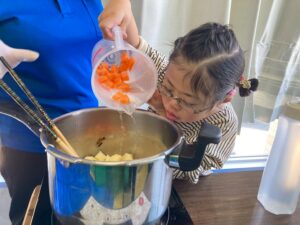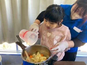 今日の第1教室はカレーライス作りです、デザートでフルーツヨーグルトも作りました。