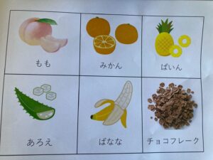 具材は「もも」「みかん」「バナナ」「アロエ」「チョコフレーク」「パイン」です、好きな具材を選びましょう。