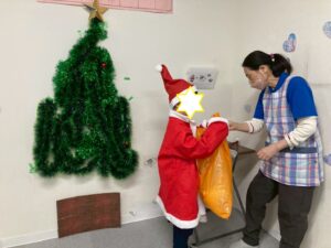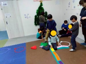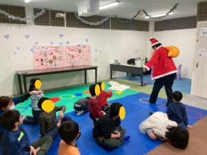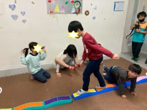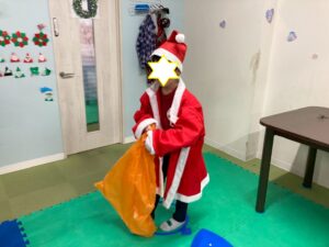 第二は『クリスマス運動遊び』です。サンタの服と帽子をかぶって背中には大きなプレゼント袋。その格好でサーキット運動です。バランススト-ンやトンネルにジャンプ…ゴ-ルの家に無事プレゼントが届けられるかな。