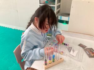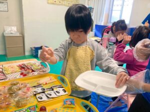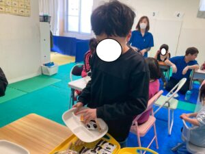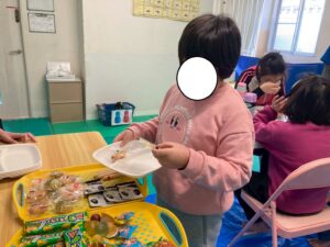 訓練室➁では「ライズベイカリー」を行いました!数種類のパンの中から、自身の好きな物をトングを使いお皿へ、指先の運動と共に後のお友達の分も考えながら行いました!
