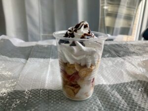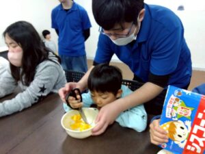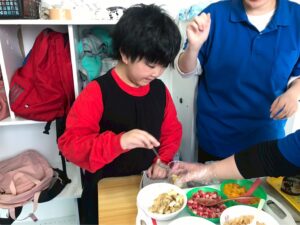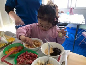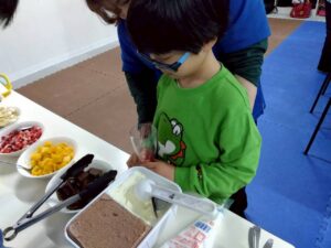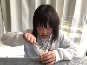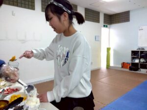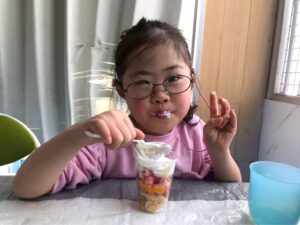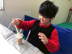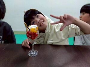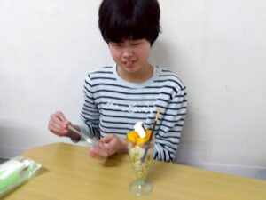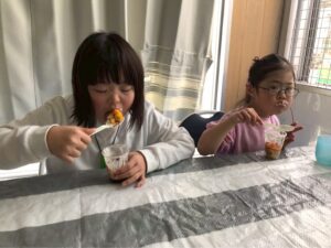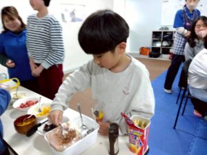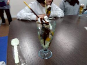 第1教室は「パフェ」作りです、トッピングはアイス・生クリーム・はちみつ・チョコシロップ・コーンフレーク・バナナ・あんこ・きなこ・いちご・マンゴーです。