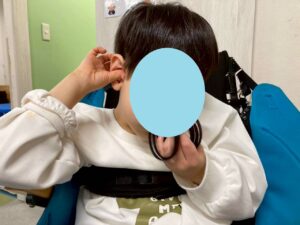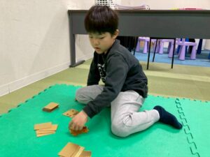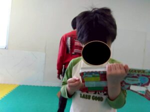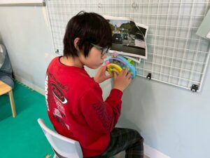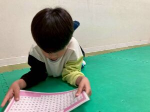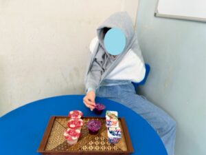 今日はお箸を使ってペットボトルキャップを掴み、お皿に移すゲームを行いました。
