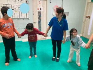 本日訓練室①では、「運動遊び」では、紐くぐりを行こないました。くぐるはもちろん、足を上げ乗り越える、時には少し持ち上げて!