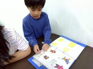 第二の『SST』はジェスチャ-ゲーム。ひとりがお題のカードを引いて、書いてある言葉をジェスチャ-。それをみんなで当てようというものです。例えばお題が『野球』ならどんなジェスチャ-かな。当ててもらう方も当てる方も真剣です。『人に注目しよう』というのが今日の目的です。