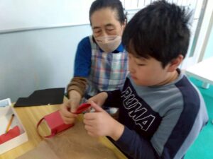 今日のライズ。第一は『1月の工作』です。鬼の小さな物入れ作りに取り組みます。色紙をぐるっと巻いた小さな箱に目や角、髪の毛…ボンドで貼り付け顔を作っていきます。可愛い赤鬼や青鬼たちが出来上がりました。