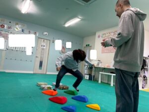 第二の『運動遊び』は、新学期から初めて利用のお友達もいるので、自己紹介を取り入れます。ジグザク走りやデコボコステップ、ケンケンパなどそれぞれが得意な運動と一緒に自己紹介をしました。自分の得意なことも一目瞭然に紹介できますね。