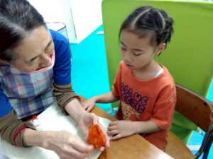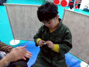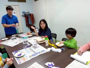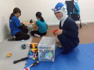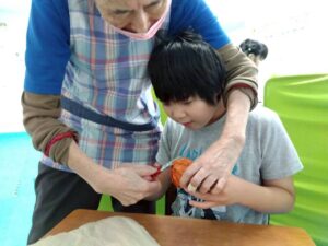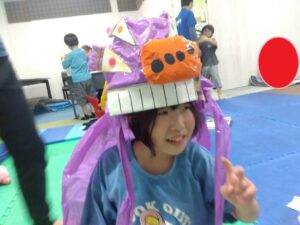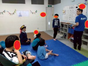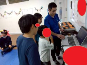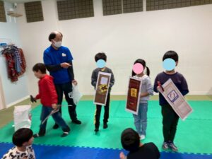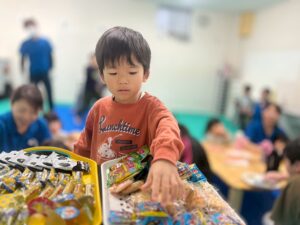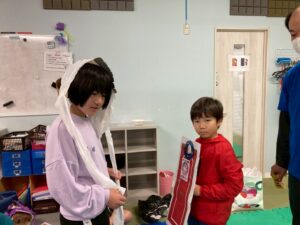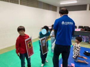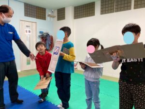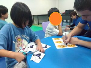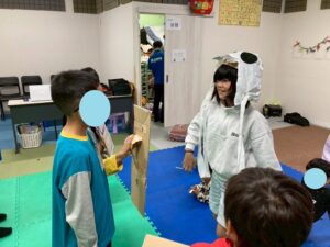 第二はハロウインの『Trick or Treat 』の練習です。ダンボ-ルで作った家のドアが4つ。それぞれいろいろなマークがついています。ハロウインのマークが付いているドアをノックして上手にTrick or Treatと言えるかな。