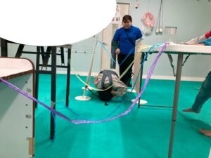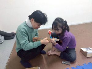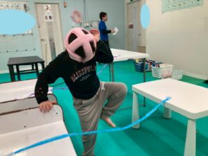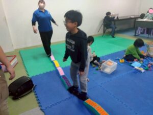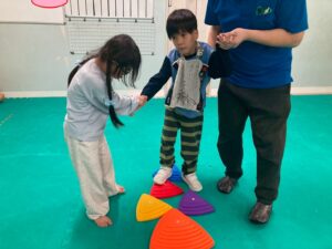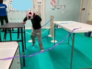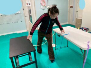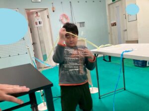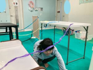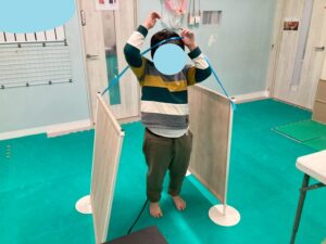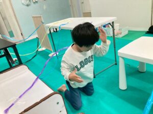 本日訓練室①では、「運動遊び」では、紐くぐりを行こないました。くぐるはもちろん、足を上げ乗り越える、時には少し持ち上げて!