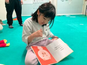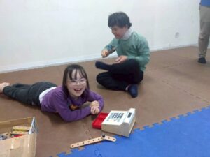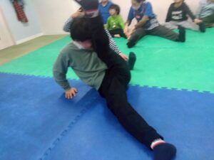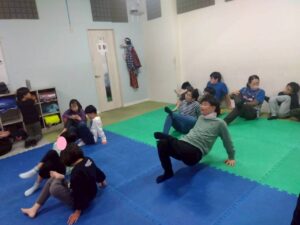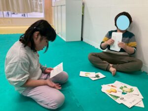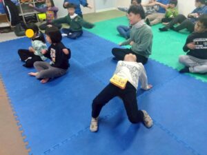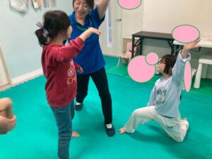 第二の『SST』はジェスチャ-ゲーム。ひとりがお題のカードを引いて、書いてある言葉をジェスチャ-。それをみんなで当てようというものです。例えばお題が『野球』ならどんなジェスチャ-かな。当ててもらう方も当てる方も真剣です。『人に注目しよう』というのが今日の目的です。