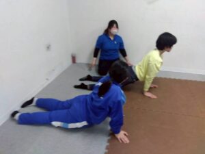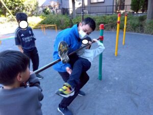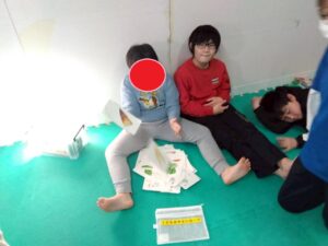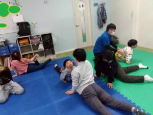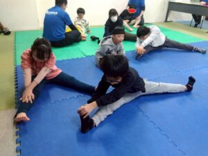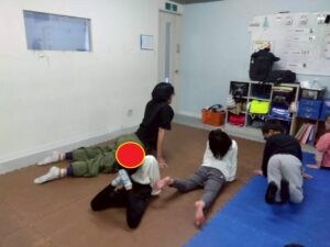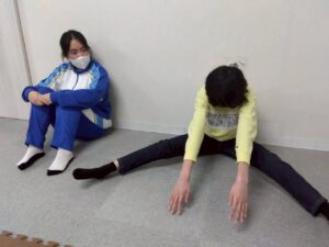 子どもたちも、お尻歩きや、片足立ち等、