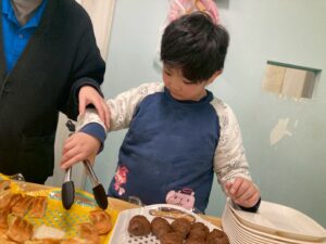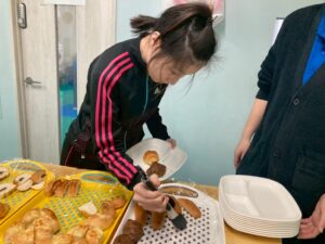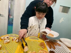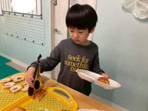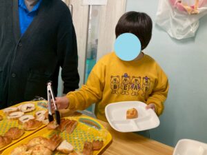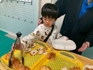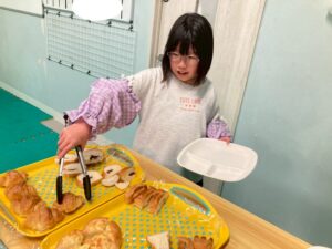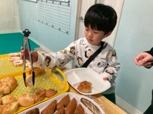 食べたいパンを自分で選びトングで上手にお皿に移しています。