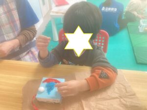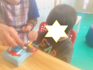 今日のライズ。第一は『1月の工作』です。鬼の小さな物入れ作りに取り組みます。色紙をぐるっと巻いた小さな箱に目や角、髪の毛…ボンドで貼り付け顔を作っていきます。可愛い赤鬼や青鬼たちが出来上がりました。