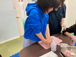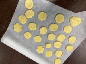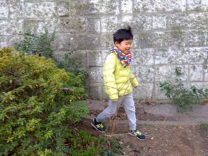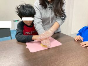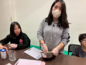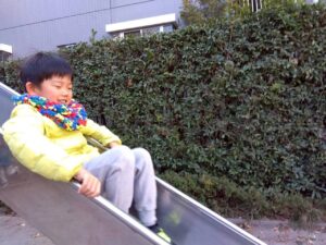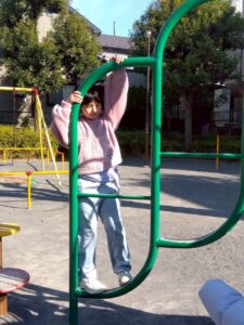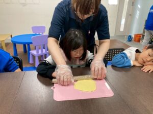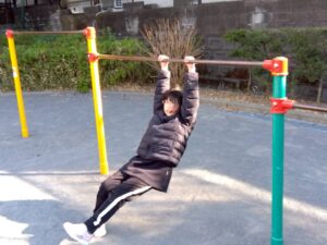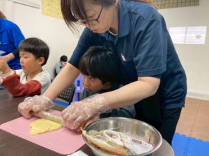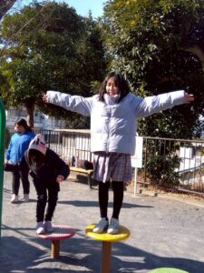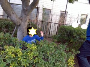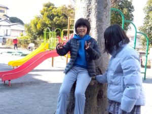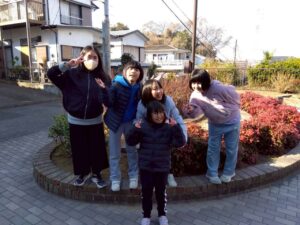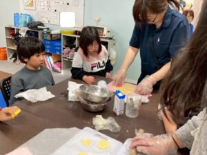 第二は予定を変更して、近くの獅子ヶ谷公園で元気に身体を動かしました。寒波の到来の中すぐにライズに戻れるこの公園は、冬の外遊びに最適です。お部屋に戻ったらおやつのクッキ-をみんなで作りました。甘いクッキ-が運動後の身体に優しくしみわたります。お腹も満足でした。