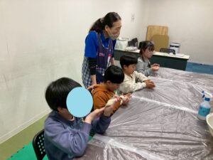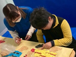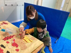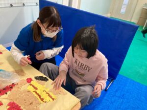 訓練室①では「壁面工作」を行いました!今回のお題はズバリ、節分!豆まきをする子どもとそれから逃げる鬼をちぎり絵で作りました!みんなでちぎって、貼って、完成はまだまだ!水曜日のお友達にバトンタッチ!そんな児童たちの姿をどうぞ!