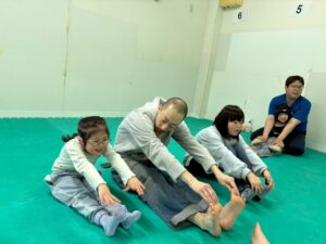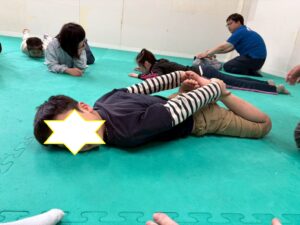 ウォーミングアップで音楽に合わせて体を動かした後、