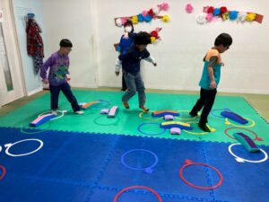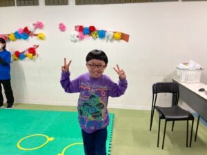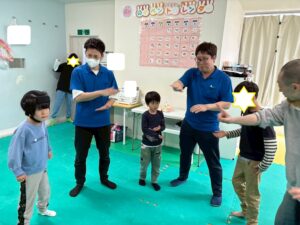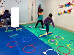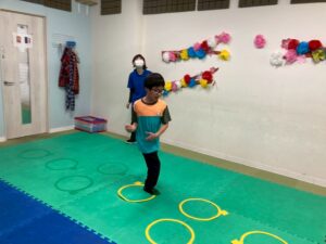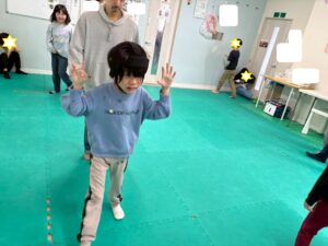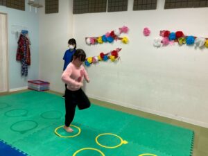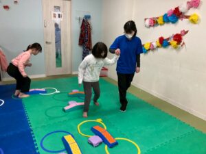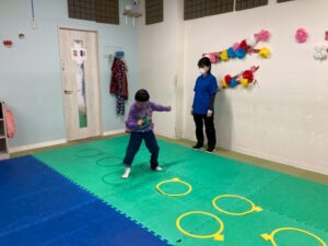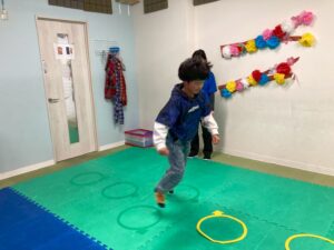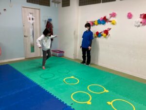 第二の『運動遊び』は、新学期から初めて利用のお友達もいるので、自己紹介を取り入れます。ジグザク走りやデコボコステップ、ケンケンパなどそれぞれが得意な運動と一緒に自己紹介をしました。自分の得意なことも一目瞭然に紹介できますね。